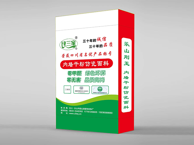 ●内墙干粉仿瓷面料 执行标准:国标JG/T298-2010 主要原料:德国瓦克食品级原料WACAER,天 然矿石,天 然植物纤维 产品用途:适用室内墙面仿瓷罩面专用,不能和乳胶漆套用 产品特点:自来水调配,附着力强,耐水,抗裂,耐老化 环保要求:本产品无毒无味,不含任何有害物质及气体 保 质 期:贮存在阴凉、干燥、透风处,保质期12个月 袋子尺寸:45cm*55cm 重 量:20kg±0.5kg